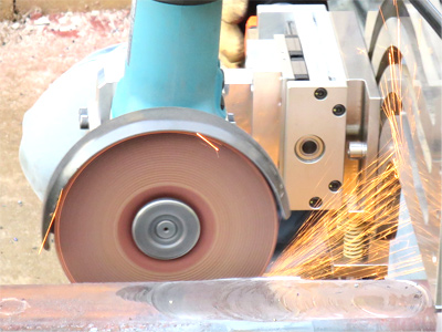 表面に砥粒のついた砥石を回転させ、金属材を削り出す作業です。